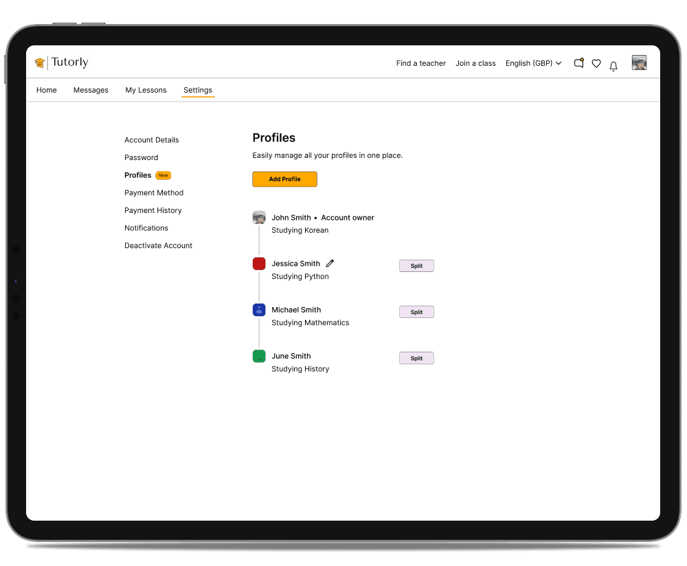 Parents can manage a single account, with sub-user profiles, allowing each child to have their own profile to manage their lessons, while still under the supervision of the parent account.