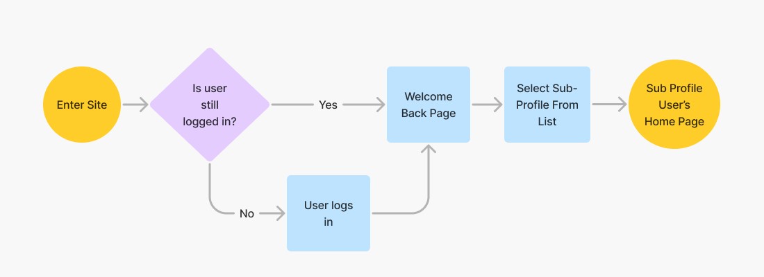 To give each sub-user their own space, this design allows each user to select their own space upon opening the site and logging in. Each user gets a customisable profile picture to make finding themselves on this list easier.