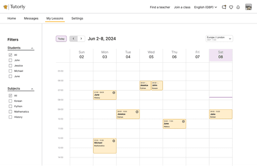 Taking inspiration from familiar calendars such as Teams and Google Calendar, I have updated the design to accomodate multi-user scenarios, using filters to navigate by student and subject.