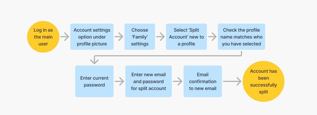 A new page can be added to the settings tab with the option to split a sub profile if needed. This will then take the user through the split account process.