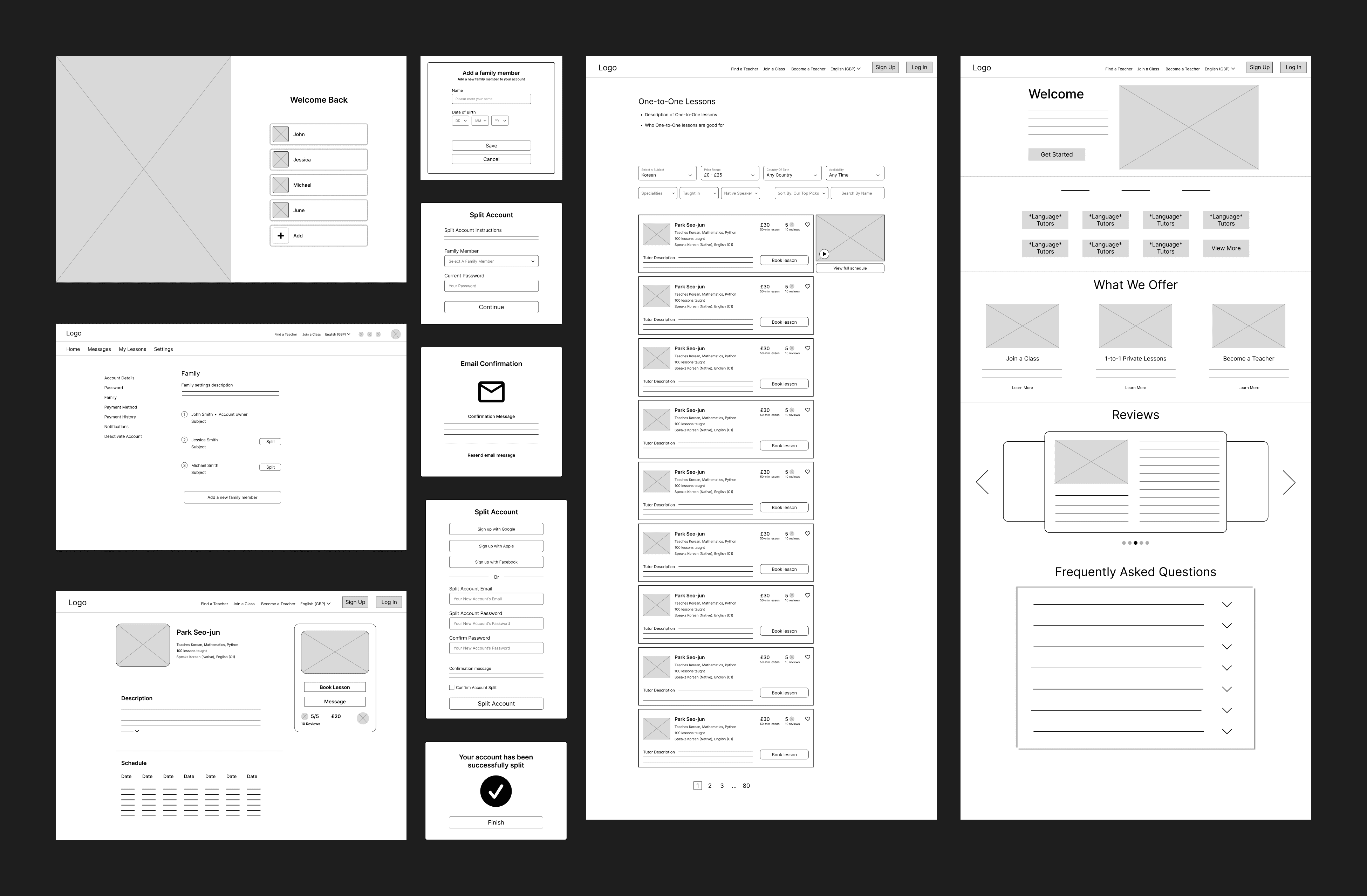 Following on from the process flows, I created a basic set of wireframes showing the general structure of each feature proposed above. Throughout, I gained regular feedback from parents and students to see which elements best suited their needs, iterating based on feedback.